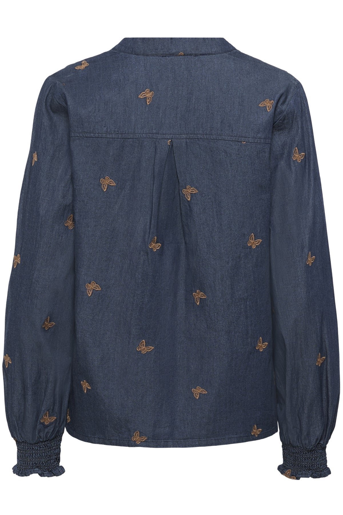 Embrace effortless elegance with this relaxed-fit denim blouse. where timeless craftsmanship meets contemporary style. Delicate butterfly embroidery adorns the fabric. adding a touch of nature-inspired artistry to your everyday wardrobe. The flattering V-neckline and fitted cuffs create a balanced silhouette that transitions seamlessly from casual days to evening occasions. Crafted by Culture Clothing UK. this piece celebrates individuality and understated sophistication—a versatile staple that encourages you to express your unique style with confidence.