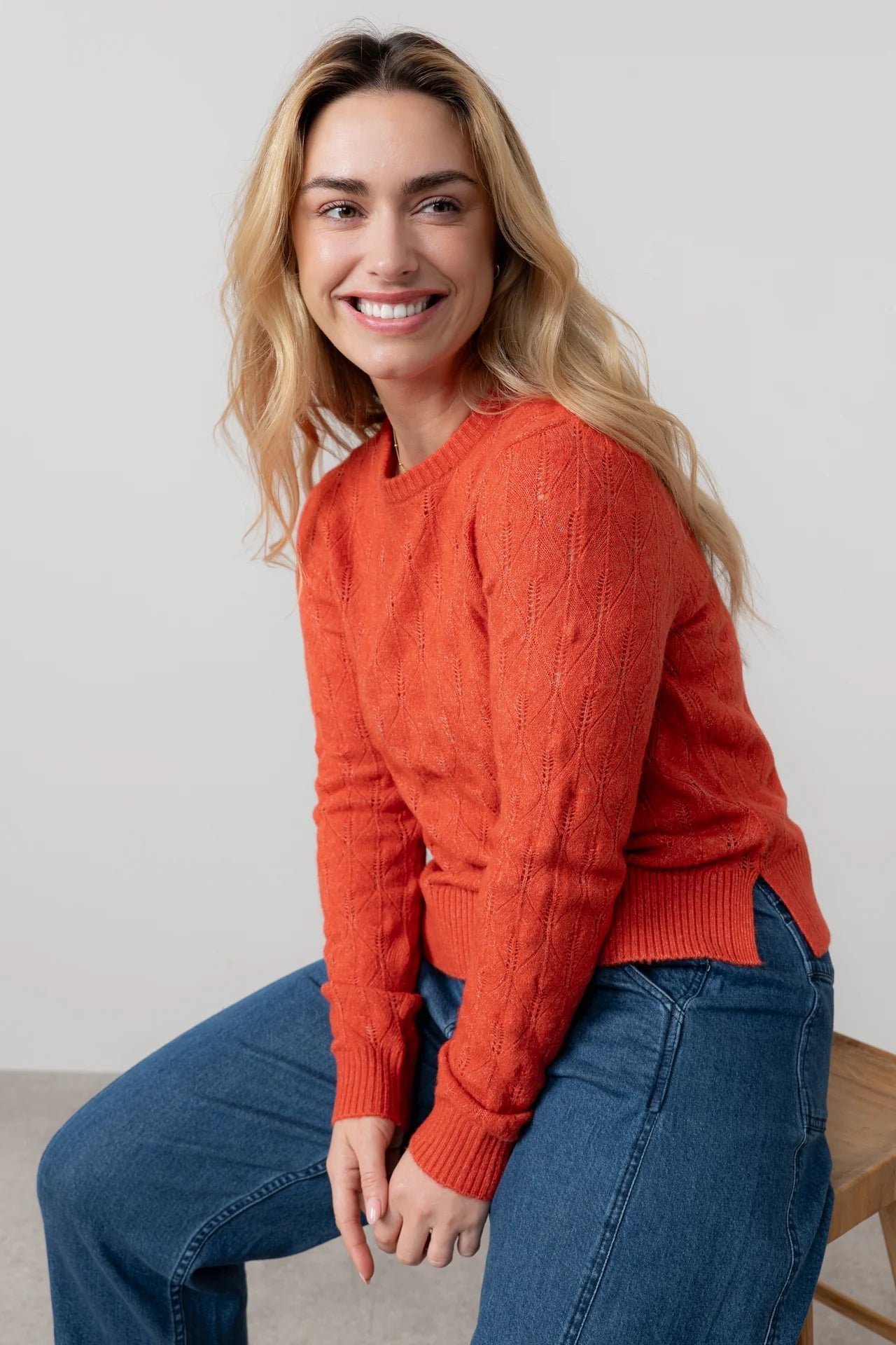 The Lily And Me Haresfield Jumper in Plain Red combines timeless style with delicate pointelle knit details across the body and sleeves. Crafted from a blended yarn featuring a touch of alpaca and elastane. it offers softness. warmth. and subtle stretch for comfort. With a ribbed crew neck. cuffs. and hem finished with side splits. this jumper effortlessly elevates any outfit. Wear it alone with a tonal tee or layer it over a crisp shirt to showcase its intricate design. pairing beautifully with cords. denim. or a printed skirt for a refined. versatile look.
